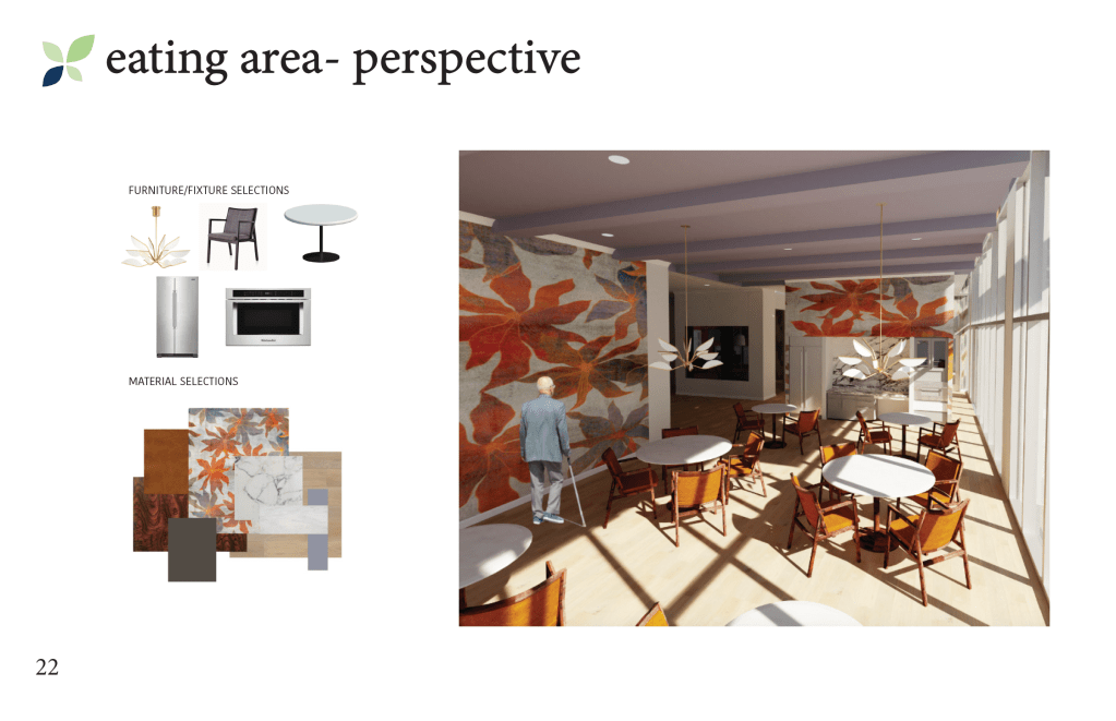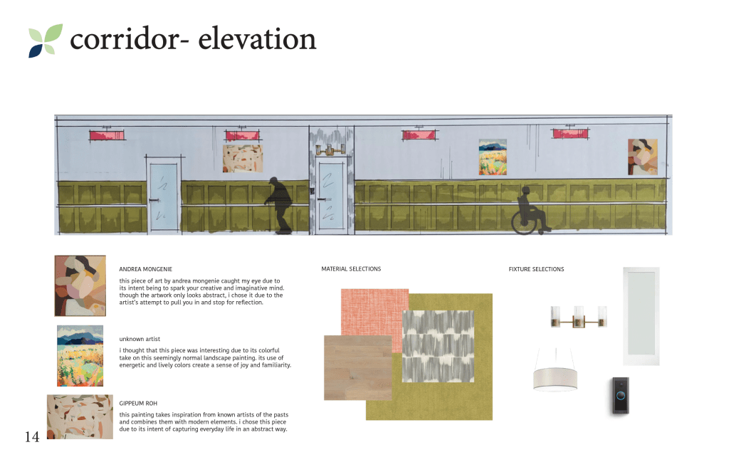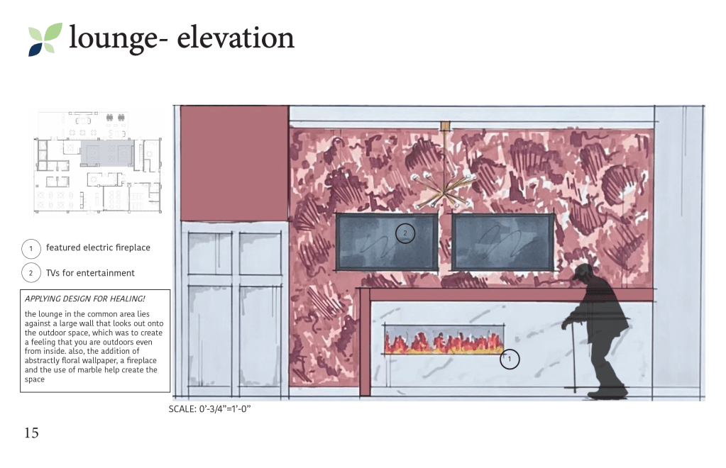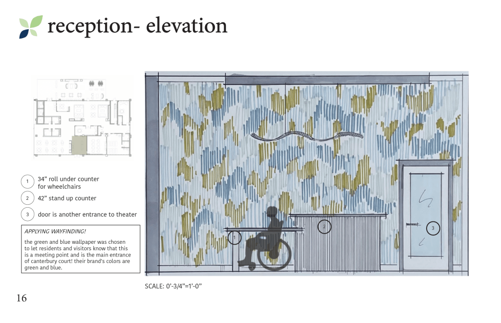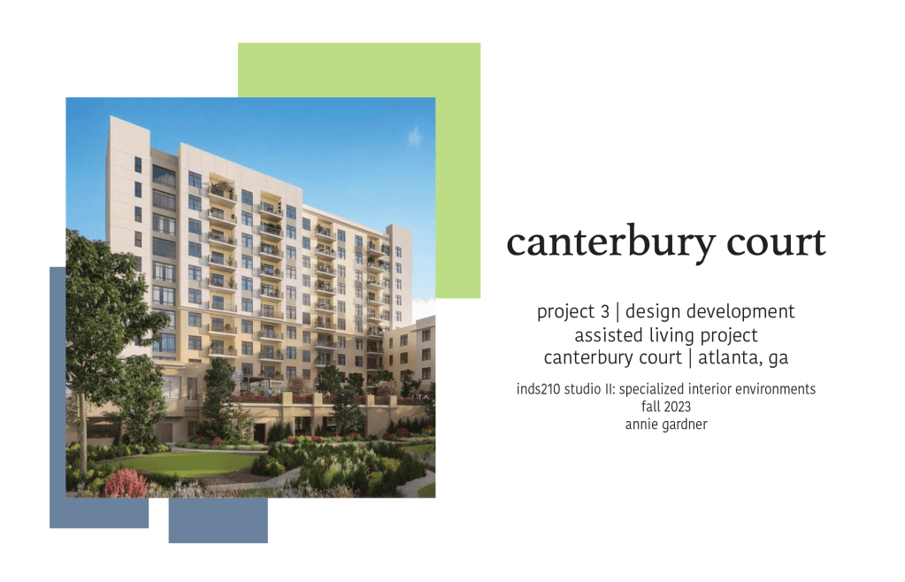 During my second studio in Fall 2023, I was instructed to design the common space of a senior living facility, Canterbury Court, located on Peachtree Road in Buckhead, which is an intown area of Atlanta. Studio II introduced ADA compliance, codes and fire safety, and real-life design obstacles. I chose to do my project in Revit (plans and renderings) and draw my elevations by hand. Our final project included material selections for each room, perspectives, elevations, renderings, client profiles, project goals, etc.
