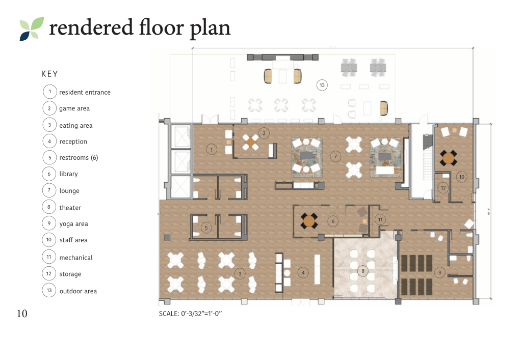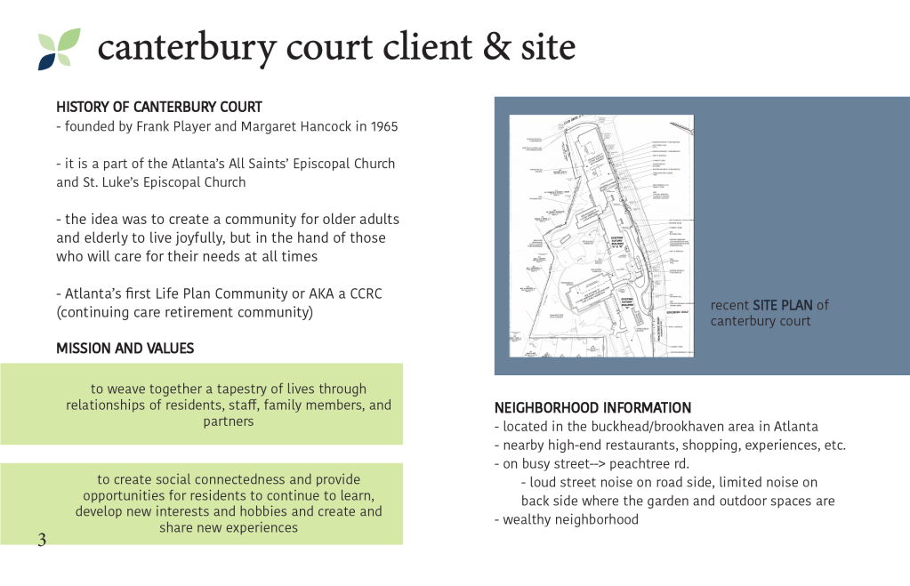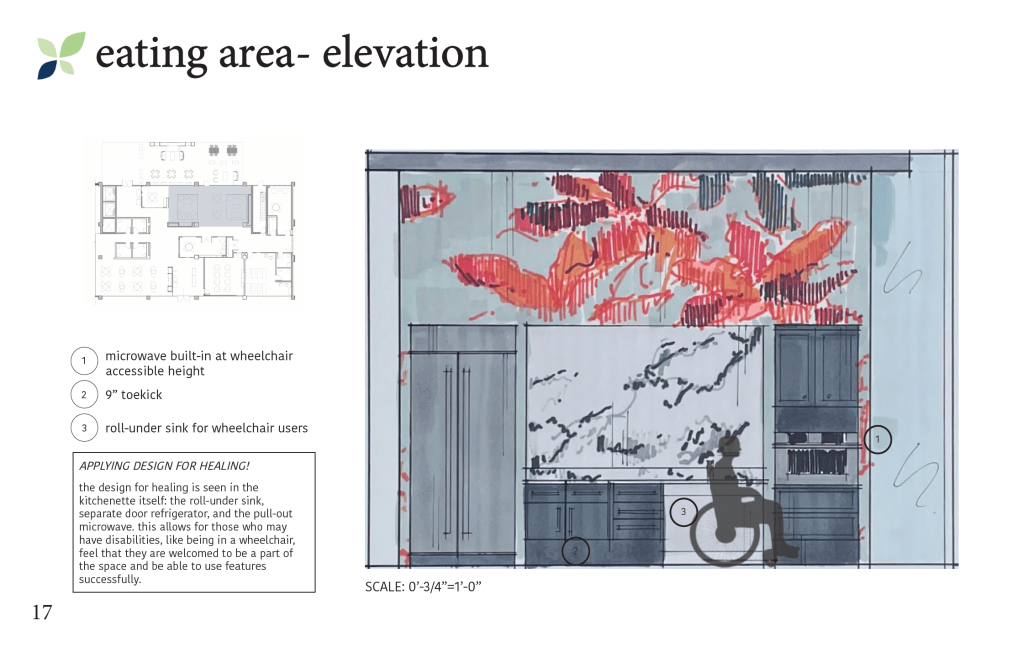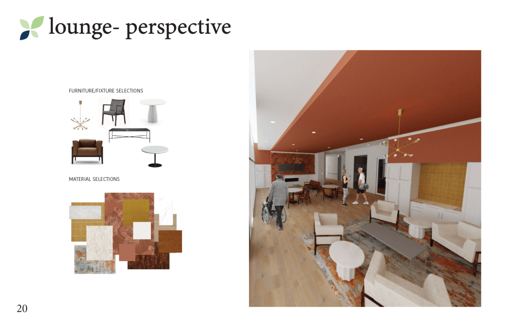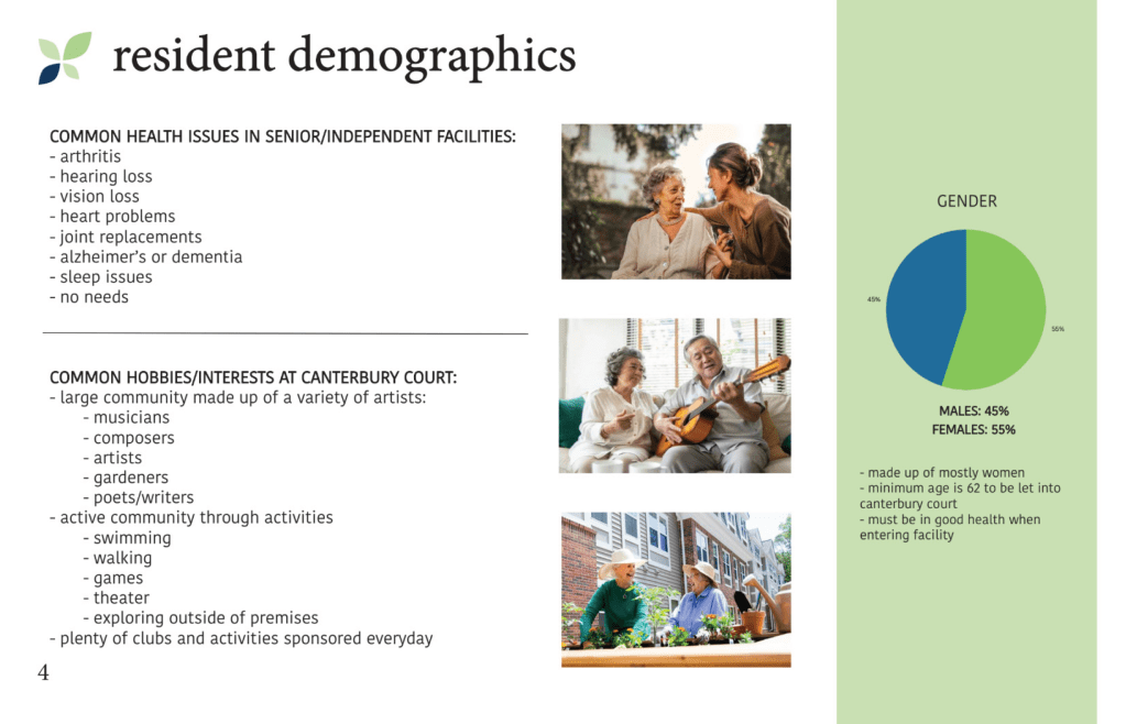 During my second studio in Fall 2023, I was instructed to design the common space of a senior living facility, Canterbury Court, located on Peachtree Road in Buckhead, which is an intown area of Atlanta. Studio II introduced ADA compliance, codes and fire safety, and real-life design obstacles. I chose to do my project in Revit (plans and renderings) and draw my elevations by hand. Our final project included material selections for each room, perspectives, elevations, renderings, client profiles, project goals, etc.